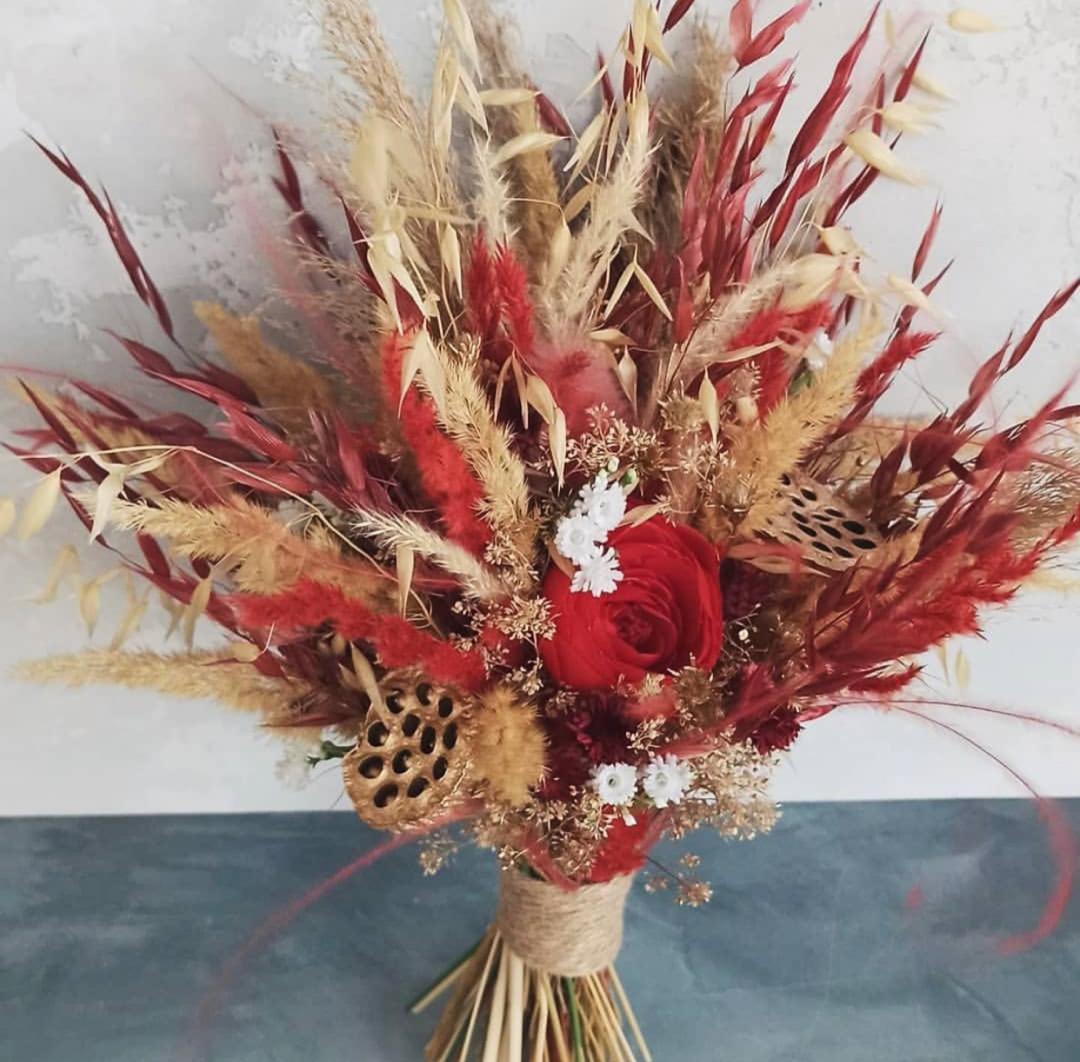 دسته گل فرمالیته تم رنگی کاهی( خام) و زرشکی گل خشک . مناسب برای عکس و کلیپ های تولد و فرمالیته عروس.