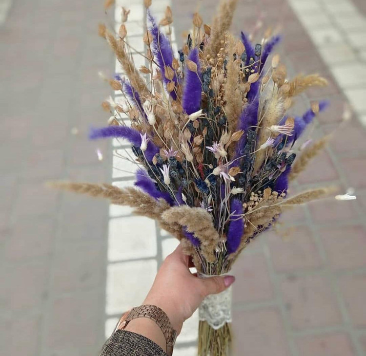 دسته گل فرمالیته تم رنگی کاهی( خام) و بنفش گل خشک . مناسب برای عکس و کلیپ های تولد و فرمالیته عروس.